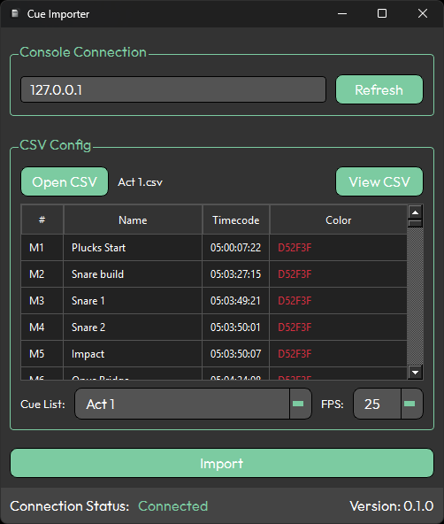 Cue Importer takes a CSV file exported from Reaper or Cuepoints and injects it into an empty cue list in Avolites Titan. Cue names and timings can be reviewed and edited within the app before the import is committed.