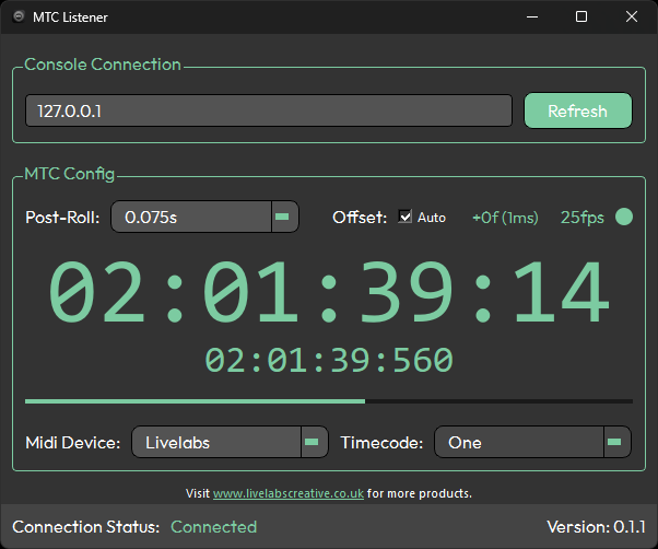 MTC Listener connects to Titan over the network and controls the selected timecode clock within the application. This allows users to program timecoded shows when no other method of getting timecode into Titan is available.